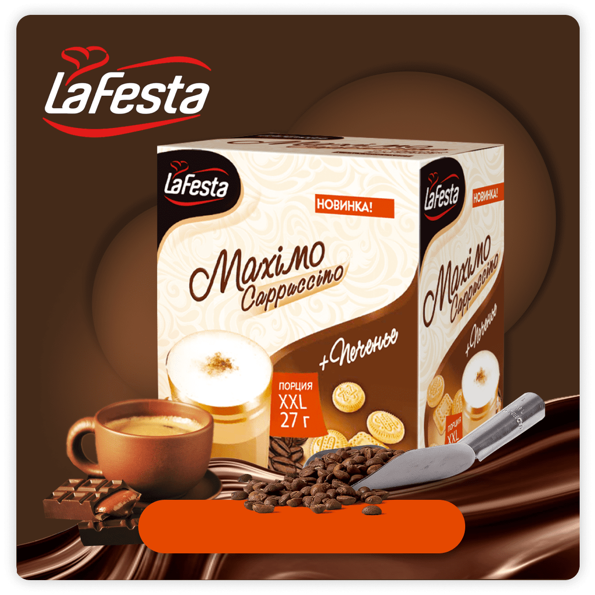Напиток растворимый с натуральным кофе со вкусом шоколада La Festa «Капучино». Гармоничное сочетание кофе, сахара и сливок, нежная сливочная пенка, бодрящий вкус и аромат ванили прекрасно взбодрят вас в любое время дня.